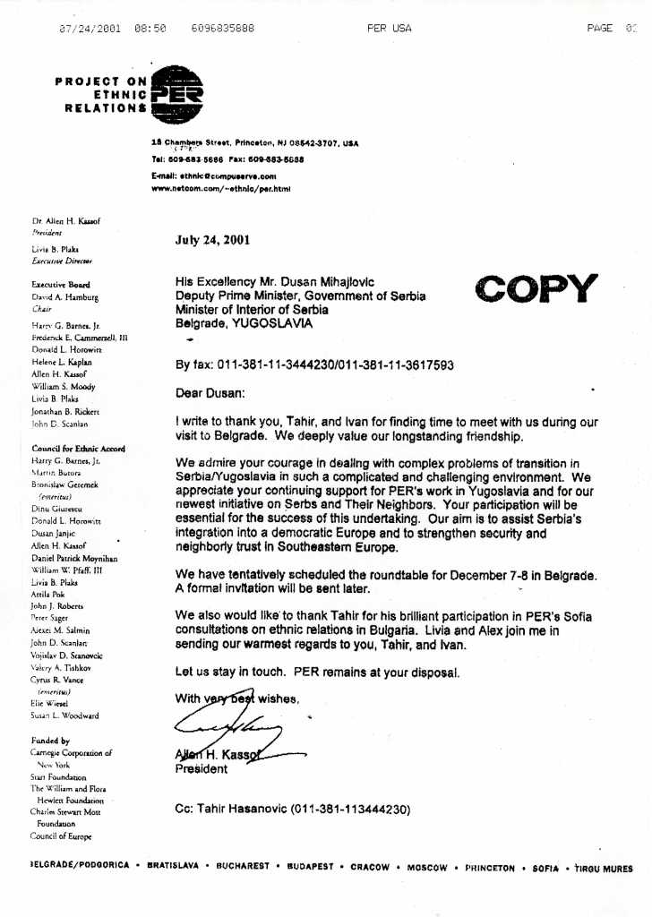 Zahvalnica za učešće na skupu Project on Ethnic Relations